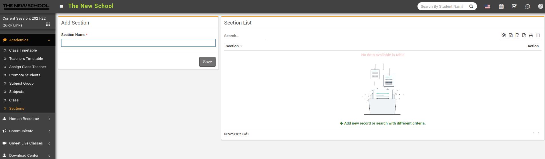 To add section, go to Academics > Sections then enter Section Name and then click on Save button. You can view this added record in the Section List on the right side of the page.