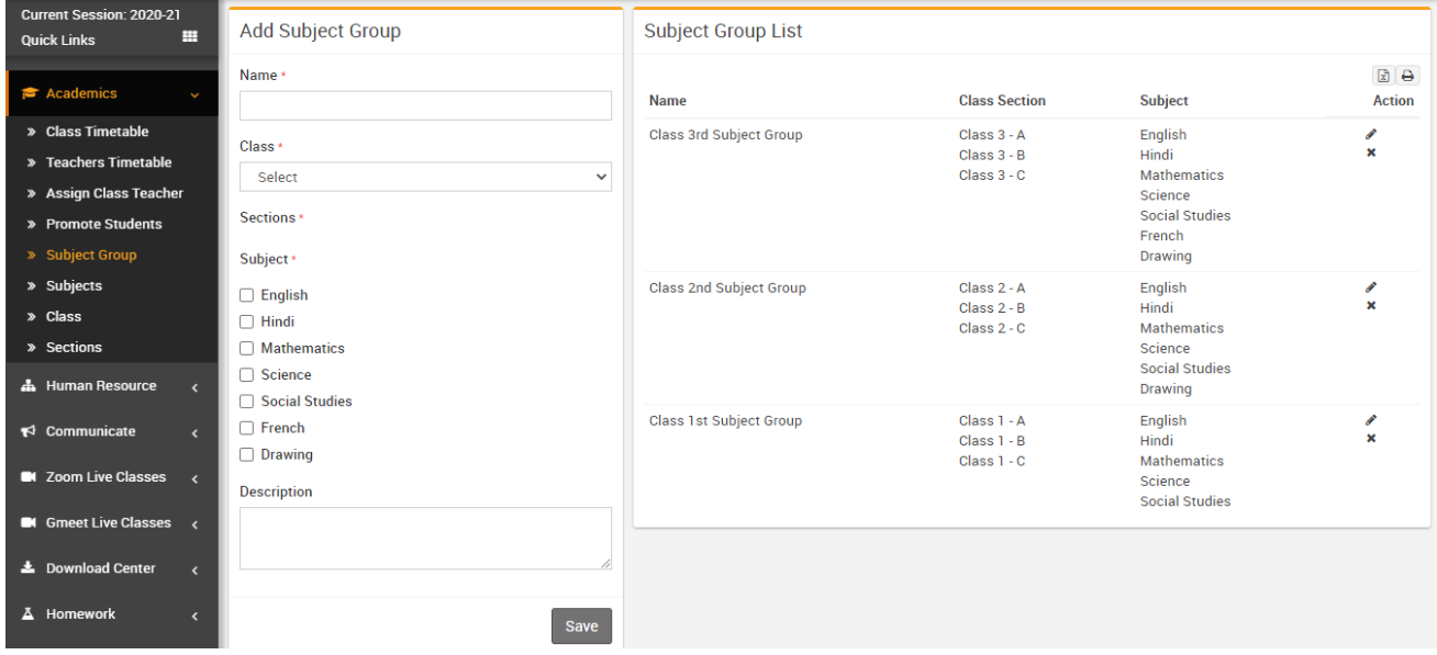 To add subject group, go to Academic > Subject Group then enter subject group Name then select Class, Section,Subjects and enter Description and then click on the Save button. You can view this added record in the Subject Group List on the right side of the page.