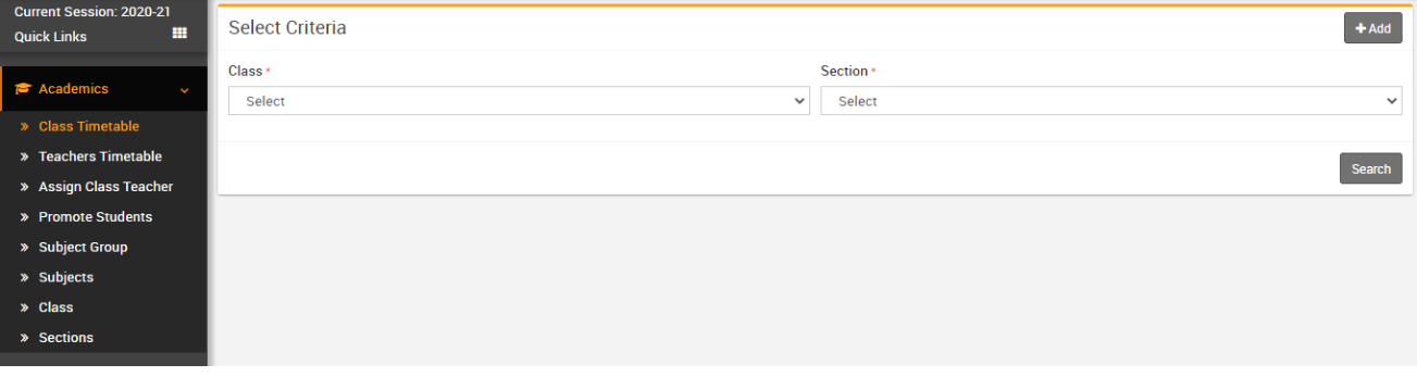 To add class timetable, go to Academic > Class Timetable click on Add button present at top right corner of the page, then select Class, Section, Subject group and then click on Search button. The list of 7 days will be shown in the below of the page.