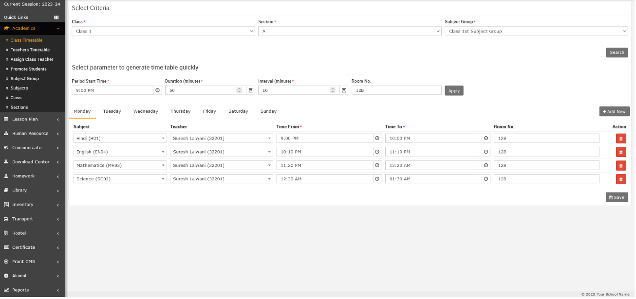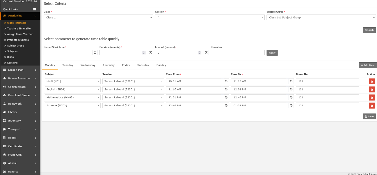 To quickly generate a timetable, enter some parameters and click on the +Add New button to add multiple subjects, add subject, and add teacher. To generate a quick timetable, add Period Start Time, Duration (in minutes), Interval (in minutes), and Room No., then click on Apply. When you click apply, you can quickly view the generated time table. If you want to change the time from, time to, or room number, you can do so manually, then click the Save button showing in the bottom right corner.