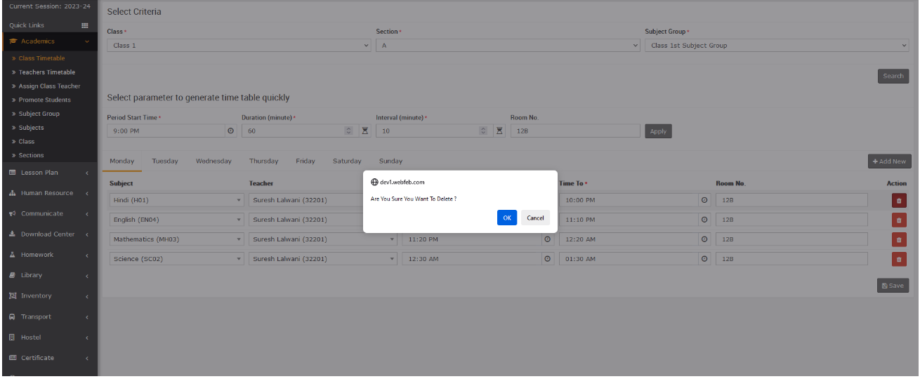 To delete class timetable click on Delete button showing at Action column, confirmation model will be open.