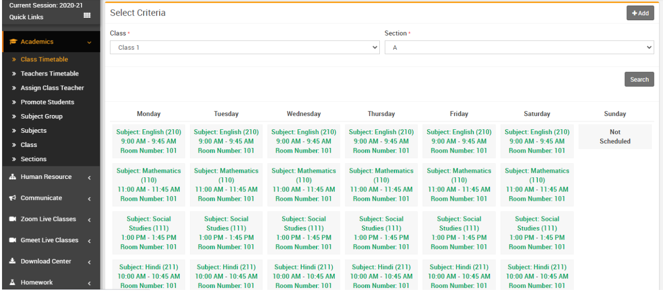 To view created time table, here select Class and Section and then click on Search button. The list of searched record will be shown in the below of the page.