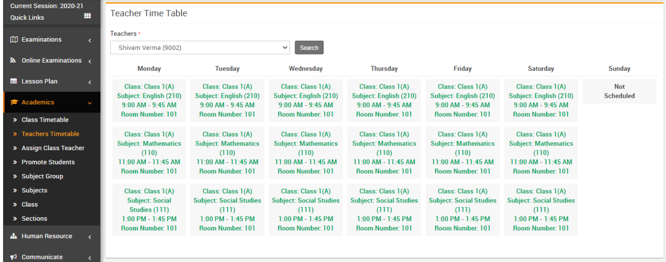 To view teacher timetable, go to Academics > Teacher Timetable then select Teachers and then click on Search button. Here teacher and other admin staff can see selected teacher timetable.